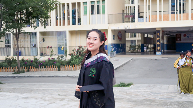 六月的巴塘,触手可及的蓝天白云,一望无际的大草原,成群的牛羊,勾勒出一幅流动的油画,一场特殊的毕业典礼在此举行。这场毕业典礼上,没有校领导,没有同学和老师,只有顾文迪和她支教所在班级的藏族学生们。顾文迪身着印有校徽、自己名字和学号的学士服,接受了学生们的祝福,而后大家一起拍毕业照,记录下这一饱含意义的瞬间,也算是给大学四年画上圆满的句号。