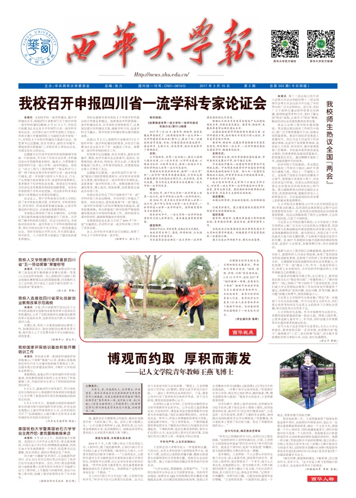 《bv伟德国际体育官方网站报》总第553期于3月15日正式印发,其中包含我校召开四川省一流学科专家论证会、人文学院青年教师王燕飞博士专访、西华“女神”谈“新时代女性”、我校音乐与舞蹈学院舞蹈团队参加央视春晚演出、计算机与软件工程学院软件工程专业学生陈庄专访、西西车队·初见台湾等精彩内容。