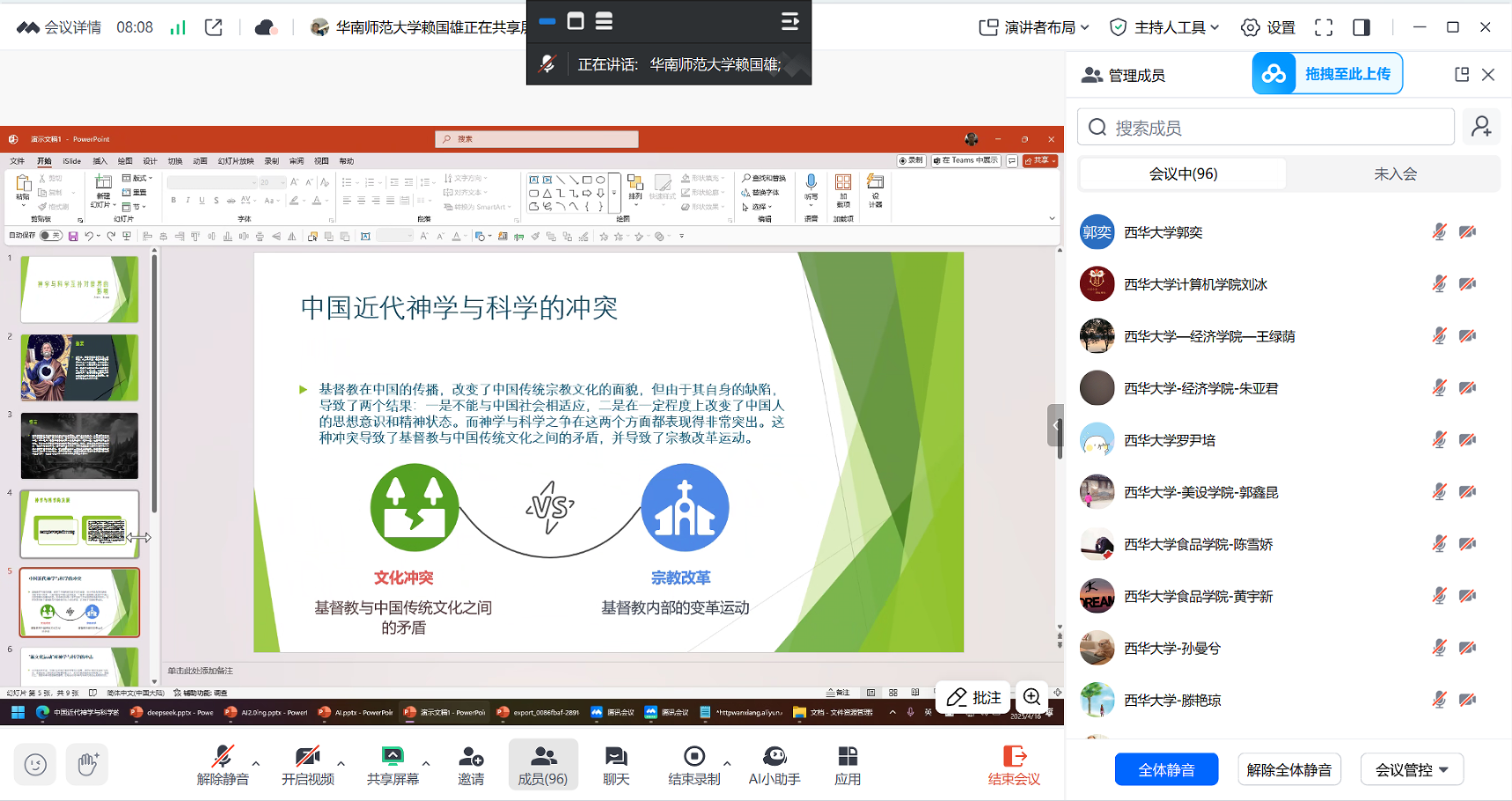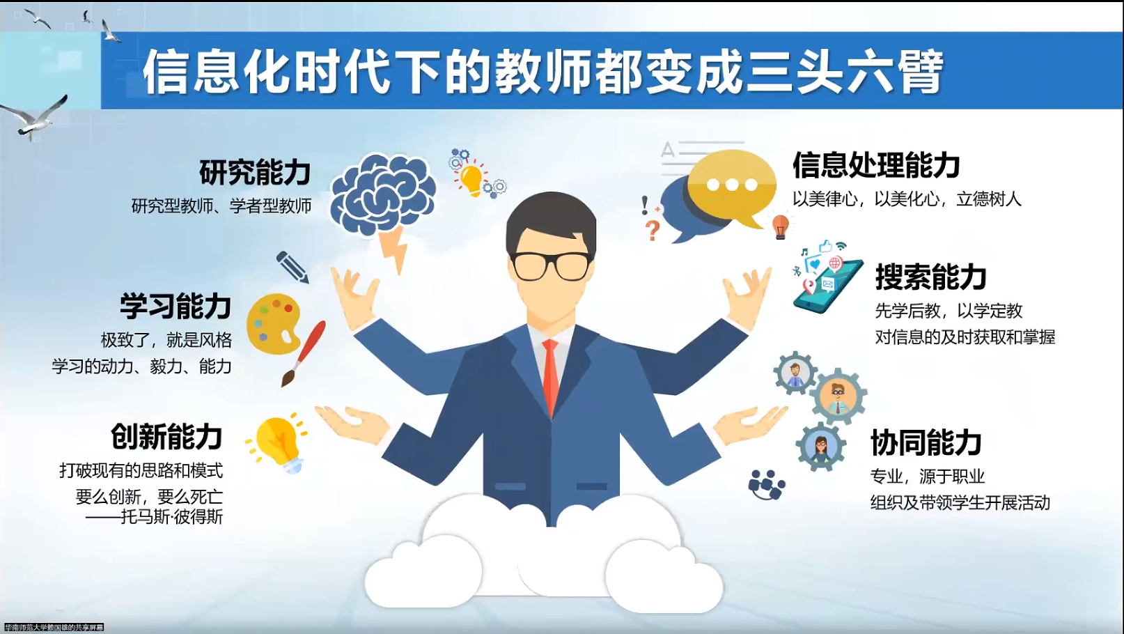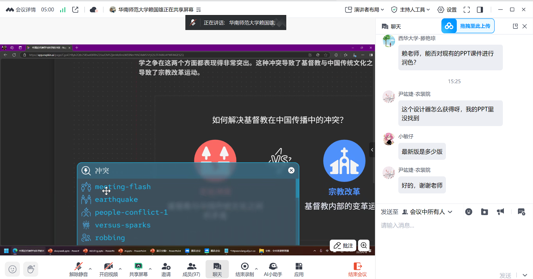 华南师范大学赖国雄老师应邀担任本次培训主讲。他系统讲解了人工智能在教学资源开发中的八大应用场景,包括基于DeepSeek的PPT智能生成技术、DOC文档秒转PPT的自动化方案、接入DeepSeek-R1的PPT封面设计方案、精准面部控制数字人创建方案等前沿技术。培训过程中,赖老师通过DeepSeek、文心一言等AI工具进行实时操作演示,重点展示了如何利用即梦AI平台完成PPT封面设计,并就参训教师在评论区提出的问题进行了详细解答。