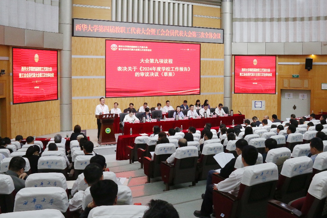 党委副书记、校长李秋实作《学校工作报告》。2024年,学校顺利通过本科教育教学审核评估,全校教职员工以实干和奋斗推进学校各项事业取得新进展,这是教职工代表积极建言、倾心献策的结果,更是全体西华人埋头苦干、团结奋斗的结果。