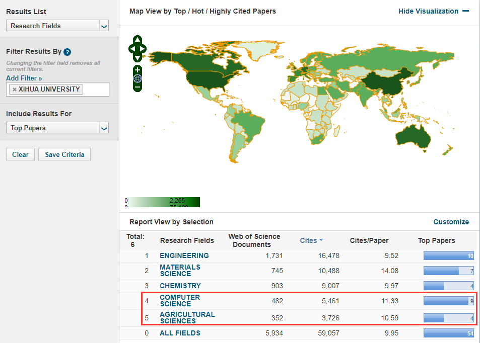 最新ESI数据显示,我校近十年全部学科领域共发表纳入ESI统计论文5934篇,总被引用59057次,篇均被引9.95次,高影响力论文54篇。其中,计算机科学学科领域共发表纳入ESI统计论文482篇,总被引用5461次,篇均被引11.33次,高影响力论文9篇;农业科学学科领域共发表纳入ESI统计论文352篇,总被引用3726次,篇均被引10.59次,高影响力论文4篇。全球进入ESI前1%的机构共有9718个,我校位列3195位(在中国内地科研机构中名列第446位);全球进入计算机科学学科ESI前1%的机构有836个,我校位列814位(在中国内地科研机构中名列第182位);全球进入农业科学学科ESI前1%的机构有1332个,我校位列1252位(在中国内地科研机构中名列第229位)。