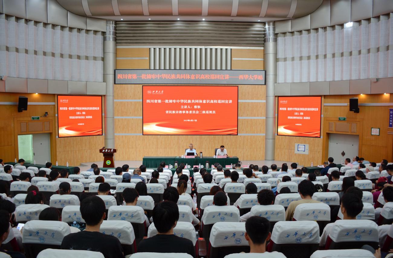 6月17日下午,四川省第一批铸牢中华民族共同体意识高校巡回宣讲bv伟德国际体育官方网站站活动在四教报告厅举行。四川省民族宗教事务委员会二级巡视员蔡钦作宣讲报告,党委副书记朱兴华主持并作总结讲话。校领导,党群部门副处级以上领导干部,各学院书记,马克思主义学院班子成员、思政课教师代表以及各学院学生代表近300人参加活动。