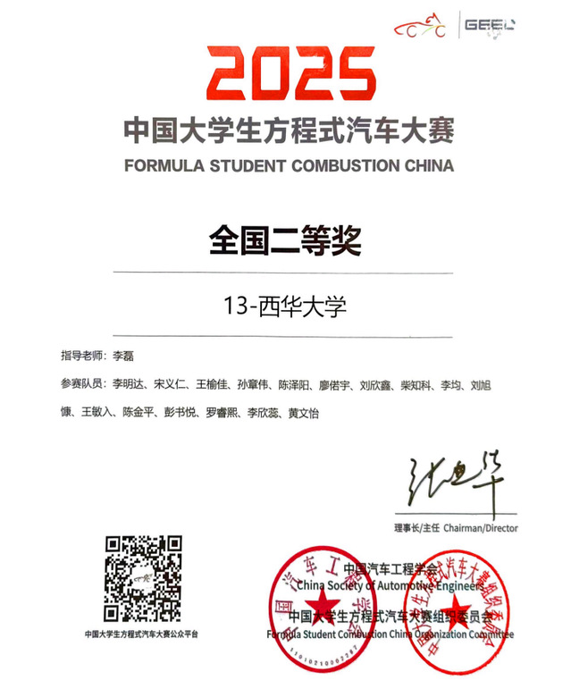 10月12日,2025“吉利杯”中国大学生方程式汽车大赛在郑州圆满落幕。bv伟德国际体育官方网站大学生燃油方程式车队凭借扎实的技术功底与出色的现场发挥,最终斩获全国二等奖,并在多个赛项中表现优异,展现出卓越的工程实践与临场应变能力。