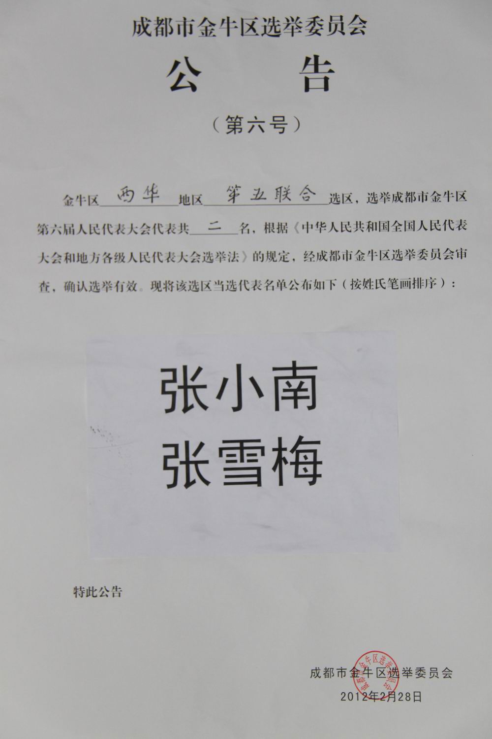 2月27日,由bv伟德国际体育官方网站及bv伟德国际体育官方网站社区居委会组成“西华地区第五联合选区”的3万余名选民,在1个选举大会主会场和27个投票站参加了金牛区第六届人大代表选举投票。 经统计选票并报成都市金牛区选举委员会审核,确认该选区选举有效,我校党委书记张小南、人文学院副教授张雪梅当选为金牛区第六届人大代表。成都市金牛区选举委员会于2月28日对本选区选举结果作了张榜公告。