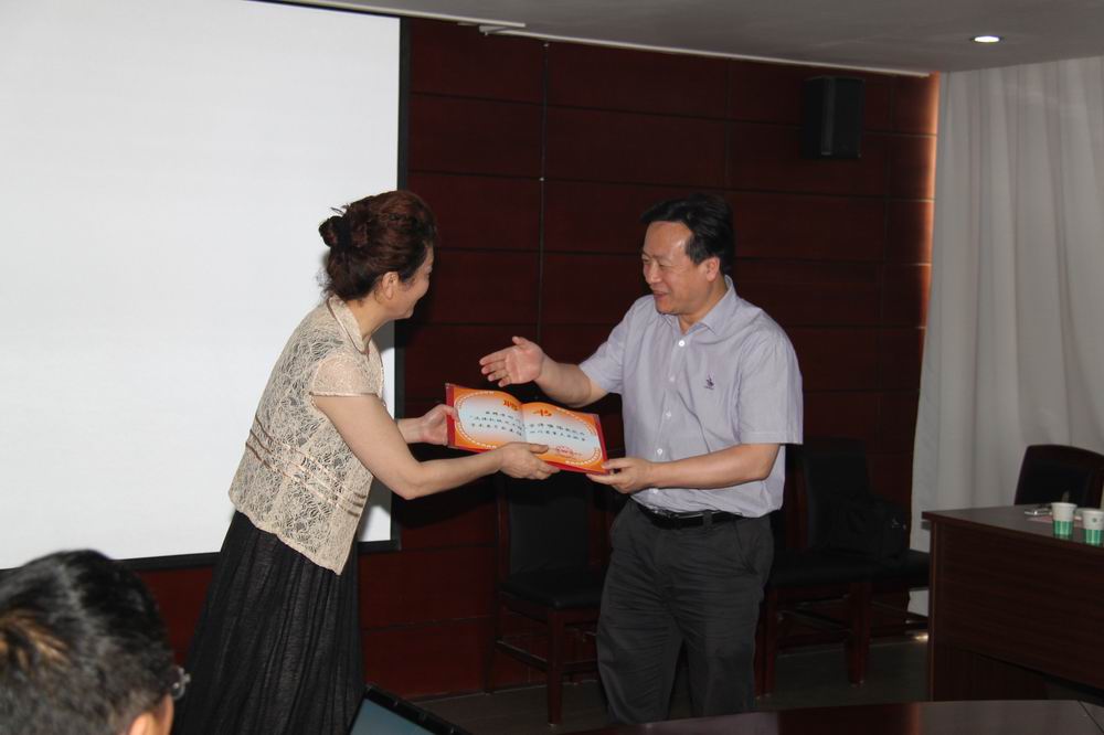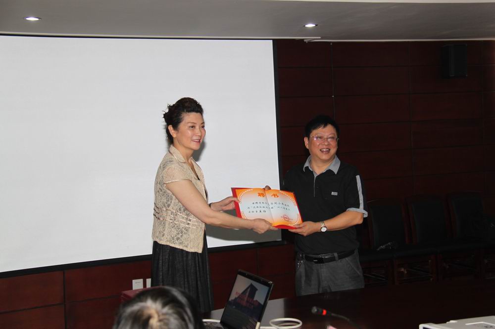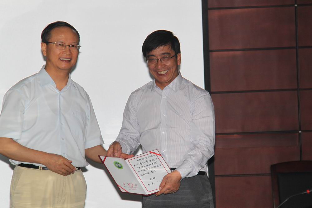 四川省科技厅副厅级巡视员郑超英(左)为学术委员会主任许唯临教授颁发聘书