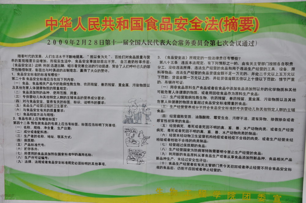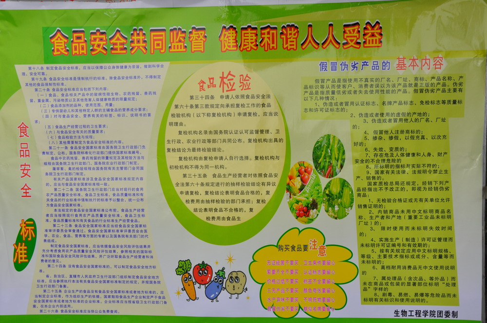 今年全国科普日的宣传主题是“节约能源资源、保护生态环境、保障安全健康、促进创新创造”。我校紧紧围绕“食品健康安全”这一主题集中开展了一次科普宣传活动。 为深入推广普及《食品安全法》等法律法规和食品安全知识,9月15日,由科技处、校团委、生物工程学院主办,生物工程学院团委与食品安全协会承办的食品安全法常识宣传展在明德广场举行。 本次展览的内容丰富,贴近大学生的学习生活。其中包括“中华人民共和国食品安全法(摘要)”、“关注大学生营养健康,提倡合理膳食”、“日常饮食禁忌和误区”、“食品安全标志”、“食品安全标准”、“假冒伪劣产品的基本内容”等方面。 本次展览内容丰富、形式多样,多以漫画形式展现,给人生动活泼的感觉。同学们在观展的同时,旁边还有生物工程学院和食品安全协会的同学在作解释、答疑,为观展咨询的同学们讲解宣传内容。 本次关于食品健康安全的科普宣传,使过往同学更加了解了食品安全知识,增强了大家的食品安全责任意识和自我保护意识,收到较好效果。在展览现场,一位来自机械工程与自动化学院的观展彭伟同学表示:“这次宣传展的内容丰富,现场讲解的同学十分积极热情,同时对食品安全方面的知识也非常了解。展示内容中,还有很多我以前不知道甚至是误解的东西,通过此次观展,我受益颇多。”