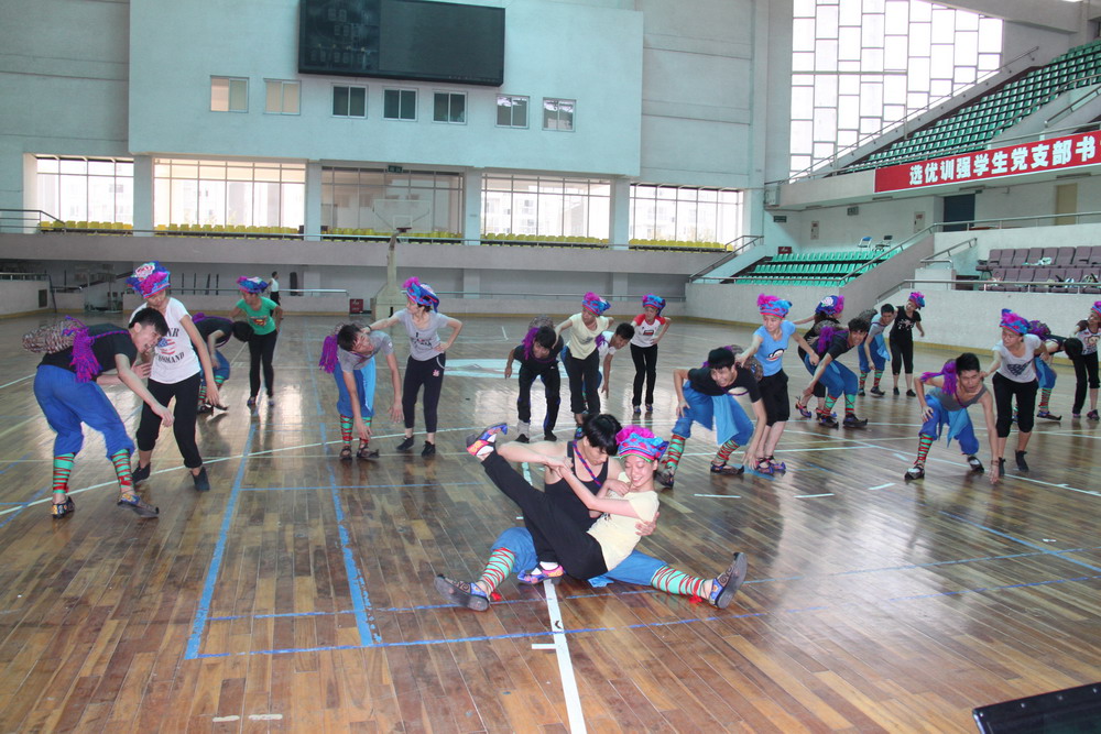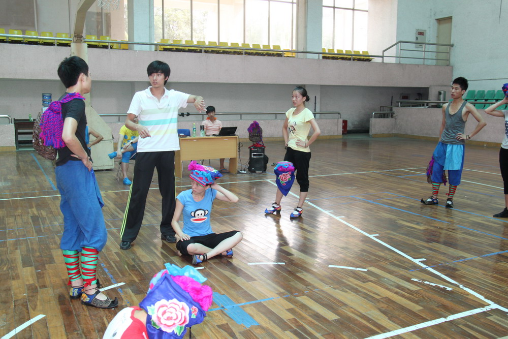 拿到入场券,对艺术学院的指导教师和参赛选手来说,既是喜悦和机遇,也是压力和挑战。为了检验教学成效,也为了学校的荣光,暑假中,在体育馆内和四食堂二楼的排练厅,可以天天见到每支大约30人的训练队伍。他们利用暑期天天排练,从头到脚没有一处是干的,在训练过程中,有汗水,也有泪水。再由于今年的高温天气,许多队员在训练中中暑了,受伤了,但是,没有一个人退缩,没有一句怨言。