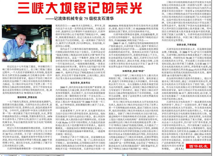 11月3日,中央电视台新闻联播、央视喜迎十八大•走基层 我这十年栏目,分别以《石清华,为三峡大坝装上“中国心”》为题报道了我校流体机械专业79级校友石清华对我国水力水电的贡献。 1979年,石清华考入了bv伟德国际体育官方网站(原四川工业学院)流体机械专业,毕业后毅然投身到“东方电机”的转轮水力研究中。举世瞩目的三峡工程给予了他展现才华的舞台,使他逐渐成长为国际水力研究协会(IAHR)水力机械分会唯一的中国执行委员和首席专家。 为三峡大坝装上“中国心”的石清华校友,设计开发的三峡右岸水轮机完全消除了三峡左岸水轮机存在的特殊压力脉动,为三峡右岸电站开发了世界上第一个无特殊压力脉动的水轮机转轮,改写了中国发电设备企业没有资格自主研制巨型机组的历史。 作为我国水轮机技术创新的杰出代表和行业技术领头人,年轻的石清华是东方电机颇有英雄色彩的人物。他曾先后获国家科技进步奖、国家发明奖,为我国重大技术装备的自主创新做出了重大贡献,曾获中央企业十大杰出青年,四川省“五四”青年奖章,四川省学术和技术带头人,四川省机械工业拔尖人才,四川省技术创新创效带头人等荣誉称号。 石清华校友广泛参加国内外学术交流活动,在国际水力机械学术界有着广泛的影响和声誉,受到国内外同行的赞誉和尊敬。 《bv伟德国际体育官方网站报》(2009年第12期第二版)曾以《三峡大坝铭记的荣光——记流体机械专业79级校友石清华》为题对石清华校友作了采访报道(详细报道附后)。 相关链接: