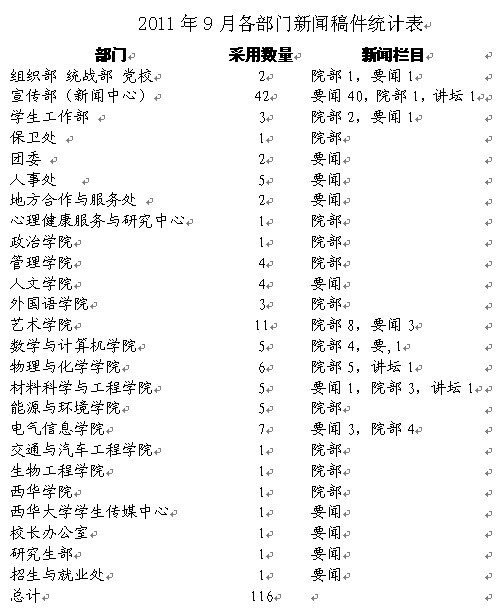 9月,党委宣传部围绕学校中心工作,重点对新生入学报到、入学教育、开学典礼、军训、西华秋韵、教学、科研、招生就业工作、党建与思政工作、辛亥革命100周年纪念活动等进行了采访报道。采写、编辑网络新闻130余条,其中编辑上传“西华要闻”、“院部新闻”116条;采用各部门、各学院来稿74篇。 具体情况见9月各部门新闻稿件统计表。