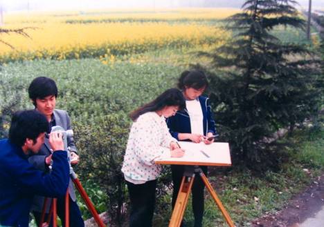 80年代,工民建的同学正在大校门外进行测绘