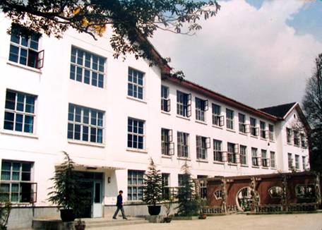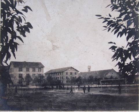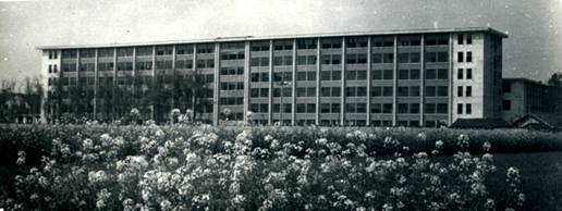 左至右依次:老教学楼、老办公楼、大礼堂、老食堂(现:四教及明德广场)